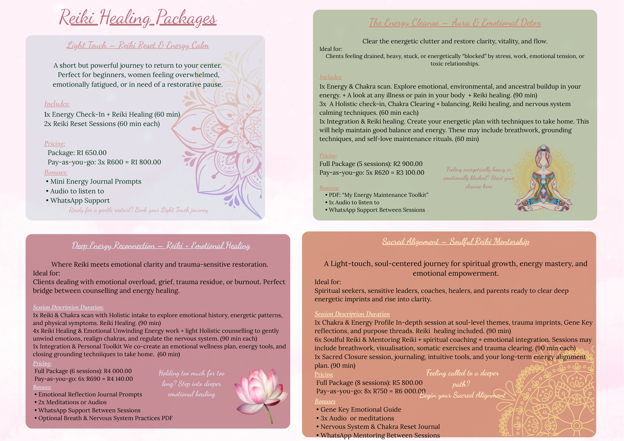You’ve been giving so much of yourself, to loved ones, to work, to the endless to-do lists, and it’s okay if you feel tired, heavy, or stretched thin. These Reiki healing packages were created as a safe space where you don’t have to hold it all together. Here, you can exhale, let the weight slip from your shoulders, and be held with care.